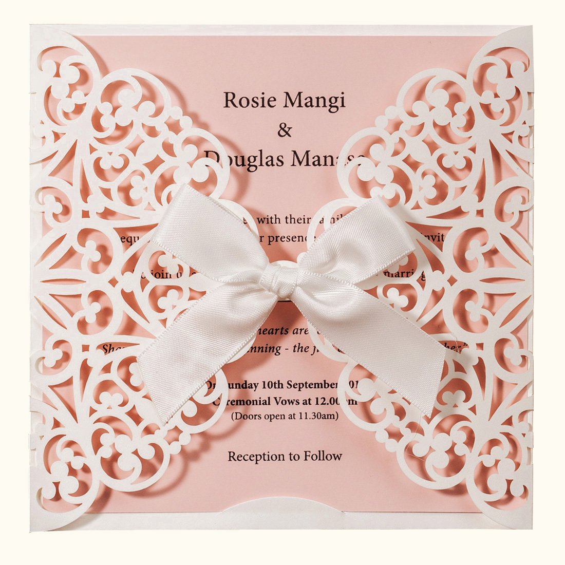 Details About Wishmade Laser Cut Wedding Invitations Square White And Pink Cards With Bow Lace