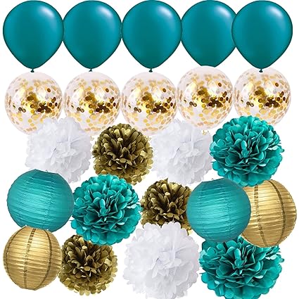 Teal Gold And Gold Confetti Latex Balloons Teal Balloons Tissue Pom Poms Lanterns Teal Baby Shower Gold And Teal Baby Shower Wedding Bridal Shower